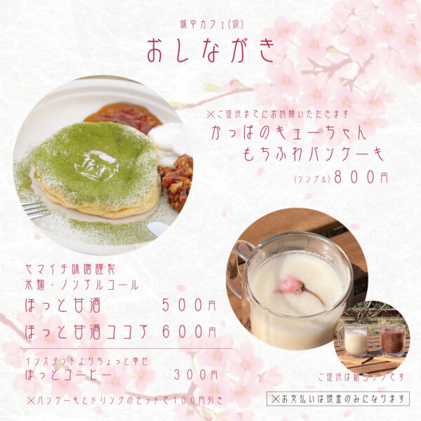 ドリンクも用意しますので、城中の桜をのんびり愛でながらふらっと立ち寄って、ください。